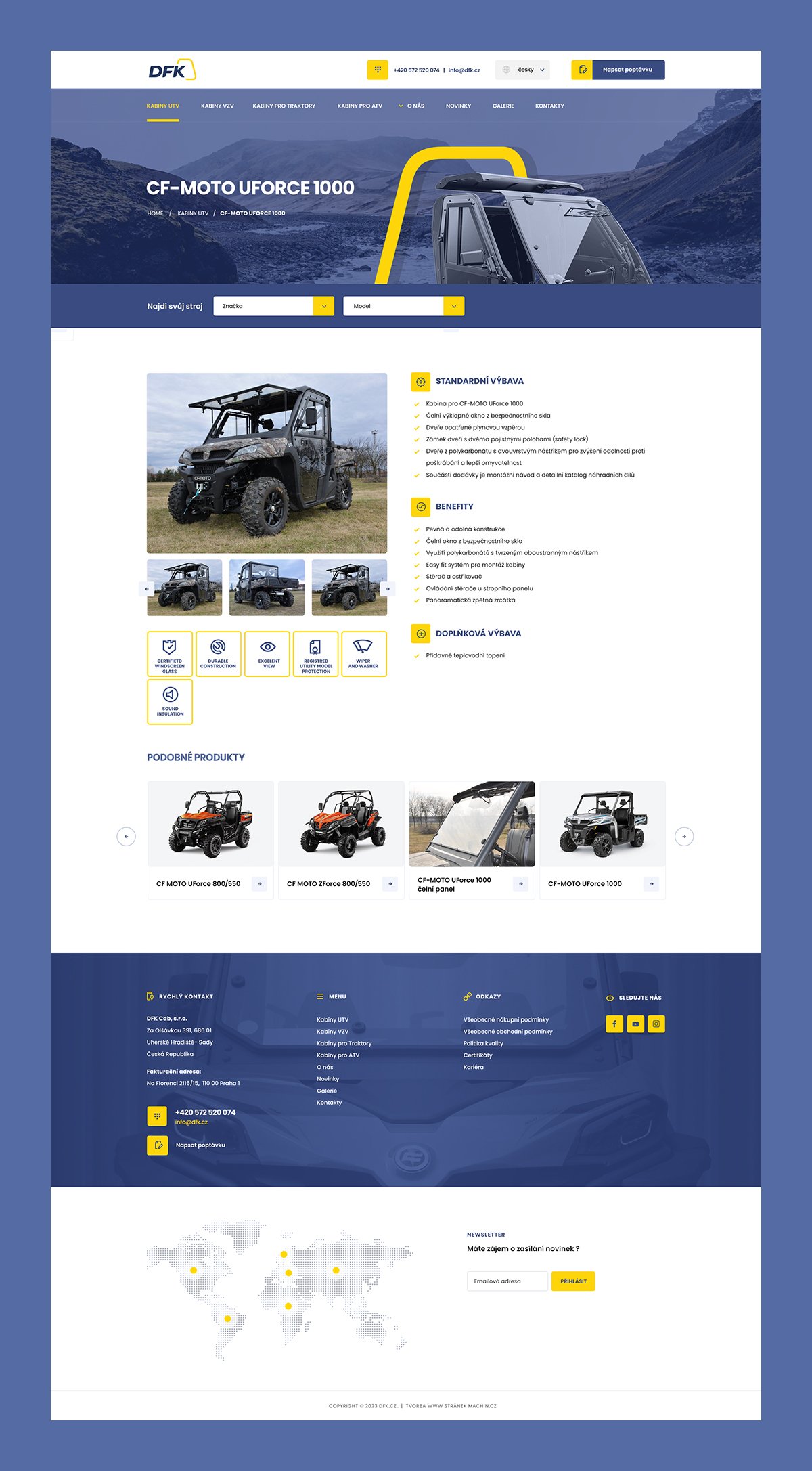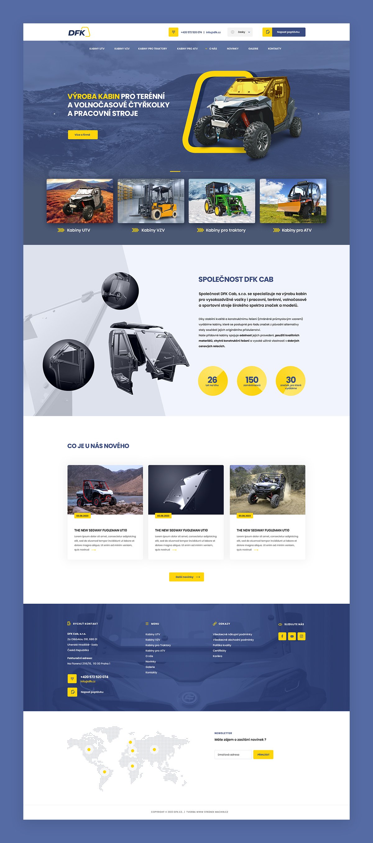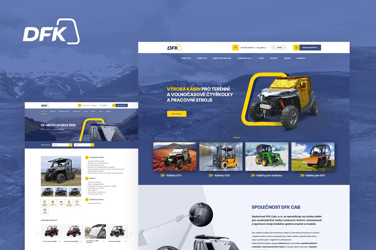Společnost DFK Cab existuje na trhu už od roku 1997. Stala se světovým výrobcem kabin pro čtyřkolky, vysokozdvižné vozíky a další pracovní, terénní, volnočasové a sportovní stroje širokého spektra značek a modelů. Na webu s několika jazykovými mutacemi najdou zájemci katalog produktů včetně databáze technických listů a manuálů i mapu dealerů.